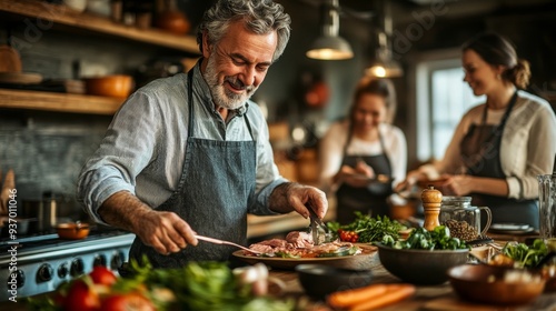 food, class, preparation, utensil, fun, photo, party, dinner, lifestyle, show, vegetable, preparing, sharing, senior, design, family, home, healthy, fresh, homemade, meal, meat, kitchen utensile, appliance, decor, alimentary, laughter, eating, at, man
