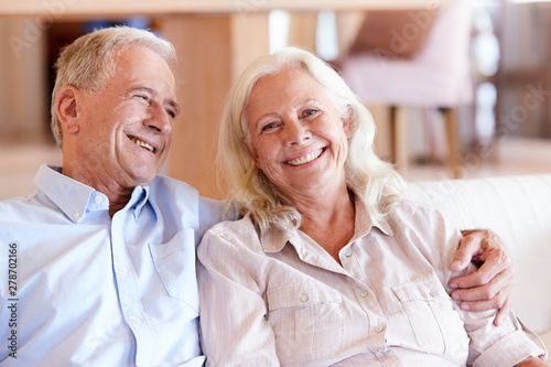indoor, day, sunlight, two people, 70s, 60s, senior, middle-aged, adult, man, woman, caucasian, husband, wife, couple, smiling, happy, confident, retirement, home, domestic life, bonding, togetherness, relaxing, love, embracing, grey hair, white hair, waist up, copy space, horizontal