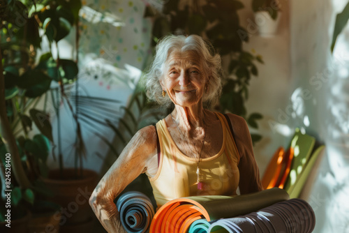 Happy senior woman with a yoga mat in yoga class, leading active and healthy lifestyle