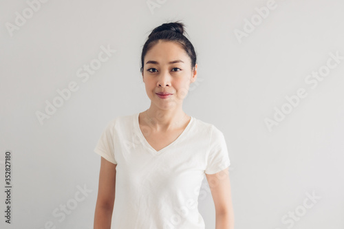 Happy smile face of Asian woman in white t-shirt and grey background.
