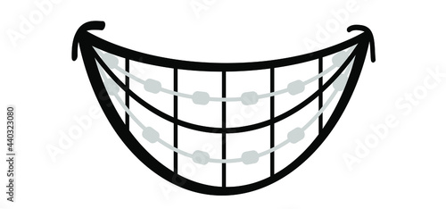 Happy smile with teeth and braces. Orthodontic dental care bracket. Cartoon, flat vector thoughts pictogram. Orthodontic dental care bracket or brace.Teeth dentist, Braces
