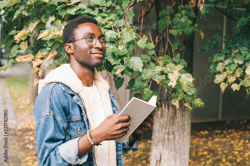 Happy smiling african man holds book, dreams in autumn city park near tree