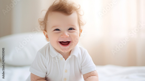 happy smiling baby home bed sitting looking daylight ai visual concept