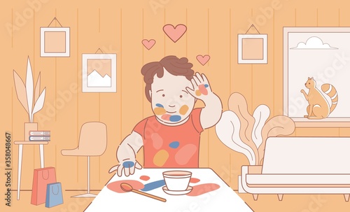 Happy smiling boy drawing and leaving handprints on paper vector cartoon outline illustration. Stained with paint child draw pictures at home or drawing studio during the art lesson.