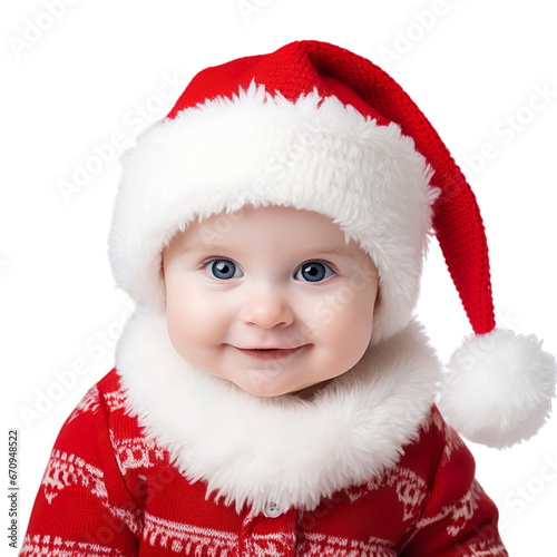 Happy smiling cute santa baby with beautiful blue eyes isolated on transparent background.