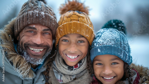 Happy smiling family ice skating, blue sky with some clouds, ethnic, deep sky blue, winter, beautifully color graded,