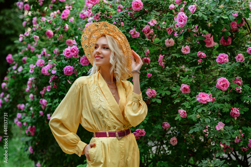 woman, fashion, yellow, rose, garden, posing, elegant, model, trend, luxury, dress, clothes, wear, beautiful, happy, blossom, summer, spring, smiling, blond, blooming, flower, pink, straw, hat, colourful, blouse, vintage, style, street, shirt, belt, look, colours, outfit, accessory, park, walking, lady, girl, female, attractive, natural, young, fragrance, perfume, aroma, fresh