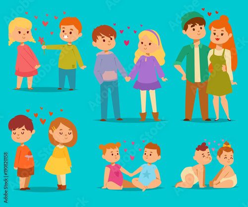 Happy smiling kids lovely couple with hearts fall in love vector cartoon characters togetherness. Couple in love romantic boys and girls together adult relationship beautiful happiness couple in love
