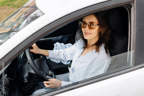 auto, automobile, business, car, casual attire, city, control, copy space, copy space, drive, driver, driving, enjoy, enjoyment, exterior, eyeglass, face, female, goggles, happy, inside, journey, lifestyle, navigation, parking, person, portrait, relaxed, routine, seat, to sit, sitting, smile, smiling, steering, steering wheel, sunglasses, transport, transportation, travel, travelling, turning, urban, using, vehicle, wheel, window, woman