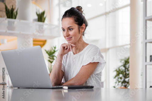 happy smiling remote working woman talking to laptop or notebook in casual outfit sitting on her work desk in her modern loft living room home office having a video chat
