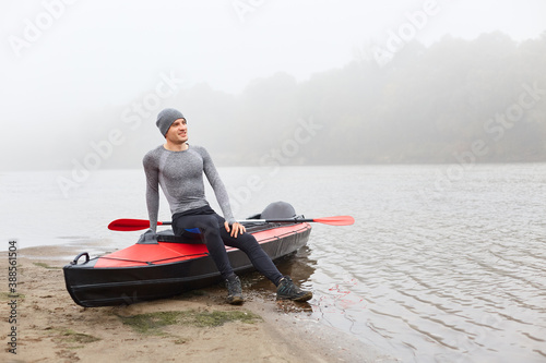 Happy smiling satisfied man having rest after padding, sitting on his boat and looking in distance, keeps his palm on his knee, young male wearing sports clothing after kayaking.
