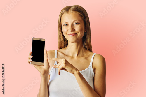 phone, smartphone, woman, showing, pointing, screen, advertising, coral, studio, smile, girl, happy, isolated, mobile, mobile phone, pink, blank, cheerful, satisfied, pretty, beautiful, people, adult, lady, caucasian, young, blond, casual attire, holding, looking, using, cellular, mobile phone, smart, hand, finger, portrait, advertisement, advertisement, technology, cyberspace, communication, text message, social, network, empty, space, display, background
