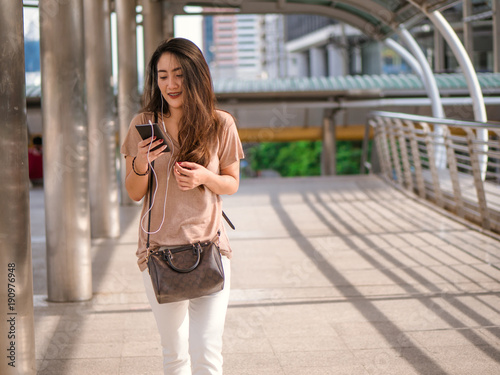 Happy smiling young asian woman listens to music in headphone and using smartphone searching for social media.