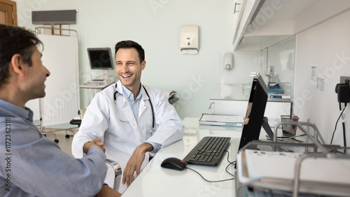 Happy sonographer doctor shaking hands with male patient in hospital office, smiling, laughing, congratulating on getting better, good medical test results after examination