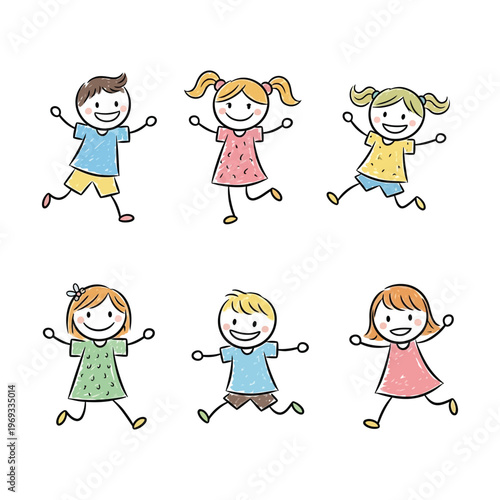 stick figure, children, children, children, children, drawing, illustration, happy, joyful, playful, jumping, running, dancing, active, energetic, diverse, boy, girl, male, female, group, team, friendship, childhood, innocence, fun, celebration, movement, dynamic, simple, cute, cartoon, doodle, vignetting, white background, isolated, vivid colors, wax crayons, art, design, graphic, vector, element, symbol, activity, recreation, youth, concept