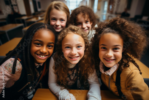 Happy student, pupil friendship concept. Multiracial classmate friends sitting together, diverse school class room. Generation z girl friends having fun social gathering inside. Youth and education