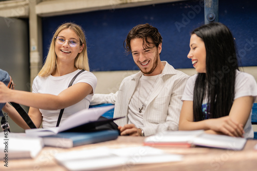 Happy students having fun after exam at the university yard, checking answers in the books
