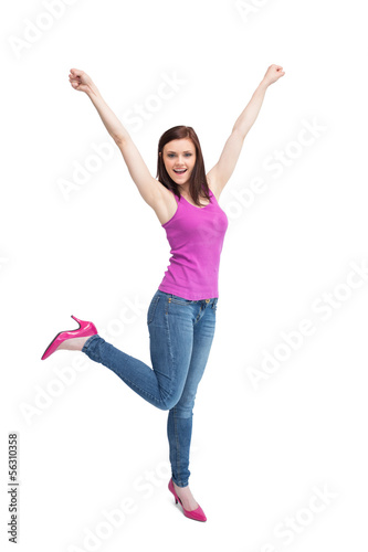 young adult, woman, female, caucasian, white background, attractive, beautiful, casual attire, clothes, fashion, natural, pretty, style, trendy, cute, urban, hip, denim, jean, tank top, purple, cool, funky, youthful, fashionable, stylish, long hair, brunette, brown hair, standing, posing, high heel, happy, smiling, cheerful, portrait, successful, success, excited, euphoria, victory, triumph, accomplishment, cheering, cut-out, isolated