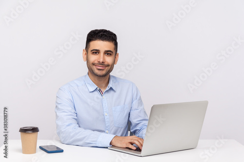 Happy successful elegant businessman sitting office workplace, typing on laptop and looking at camera with smile, satisfied enjoying job, optimistic view. studio shot isolated on white background