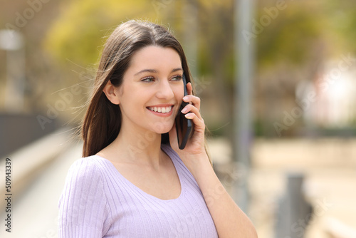 Happy teen calling on phone walking in a park
