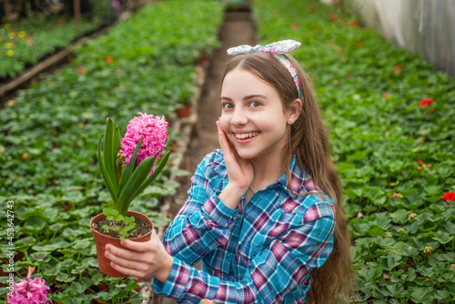 happy teen girl florist care pot plants in greenhouse, summer