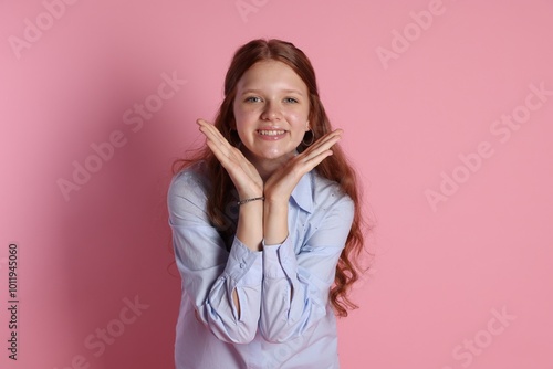 Happy teenage girl posing on pink background