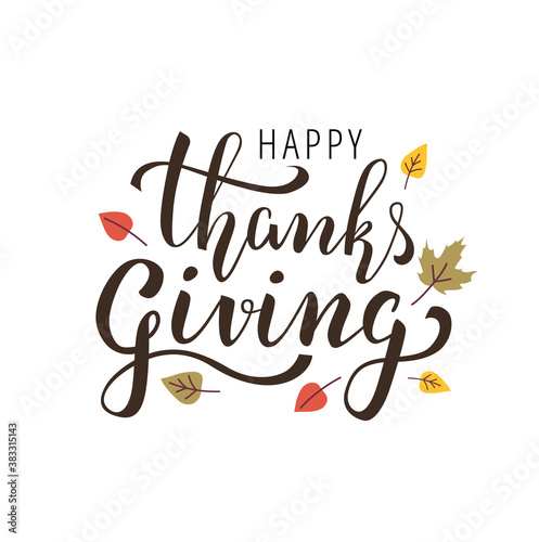 Happy Thanksgiving handwritten lettering with autumn leaves on white background. Calligraphy for greeting card