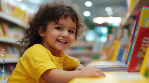 Happy toddler girl selecting colorful books from shelves in a library or bookstore, embracing the joy of reading and learning