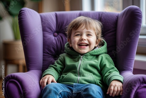 Happy Toddler in Green Hoodie Relaxing on Purple Chair in Cozy Indoor Environment