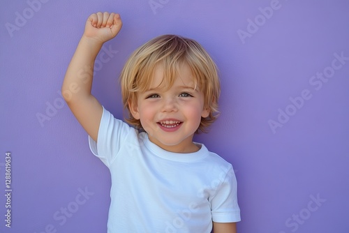 Happy toddler raises arm against purple wall