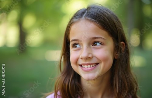 girl, tween, children, smile, smiling, happy, portrait, young, female, brown hair, brown eyes, outdoors, outside, sunlight, nature, happiness, joyful, cheerful, pretty, cute, face, head shot, closeup, looking away, green background, blurred background, summer, spring, day, light, expression, natural, beauty, one person, childhood, adolescence, youth, carefree, innocent, playful, friendly, good, mood, joy, glad, fun, laugh, laughing, teeth