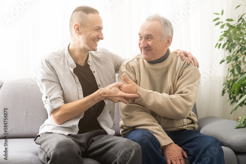 Happy two generations male family old senior mature father and smiling young adult grown son enjoying talking chatting bonding relaxing having friendly positive conversation sit on sofa at home.