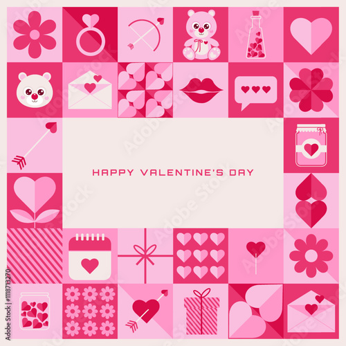 Happy Valentine's Day background with holiday simple icons, hearts, flower, in modern geometric style. Trendy design for greeting card, banner, cover, poster, wallpaper.