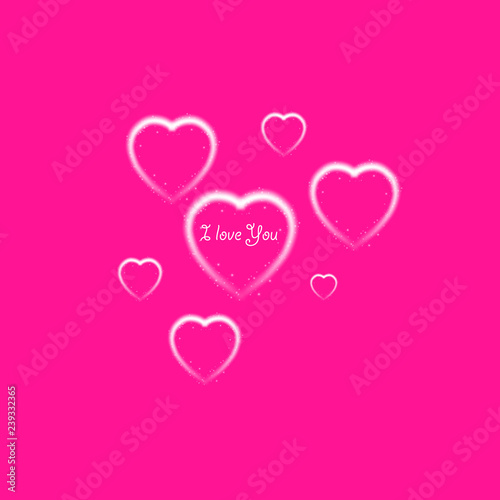 Happy Valentines Day greeting card. I Love You. 14 February. Holiday background with hearts and I Love You phrase., light, stars on plastic pink backgraund. Vector Illustration