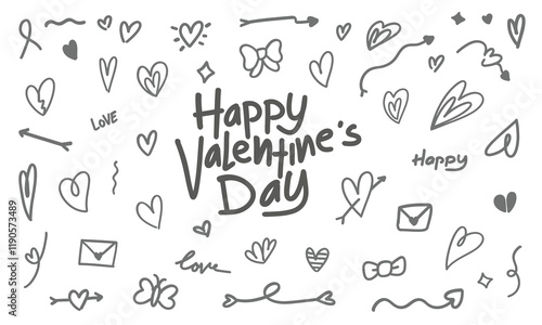 Happy Valentine's Day vector Doodle Illustration – Romantic Hand-Drawn Hearts, Arrows, and Flowers for Celebrations
