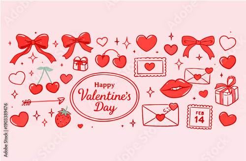 Happy Valentine's Day vector doodle set with red hearts, bows, cherries, lips, envelopes, gifts, and arrows on pink background