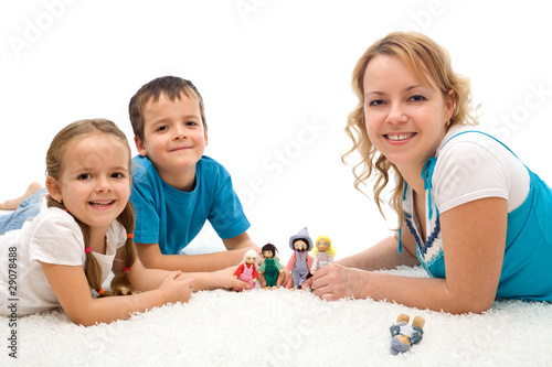 Happy woman and kids playing on the floor with puppets