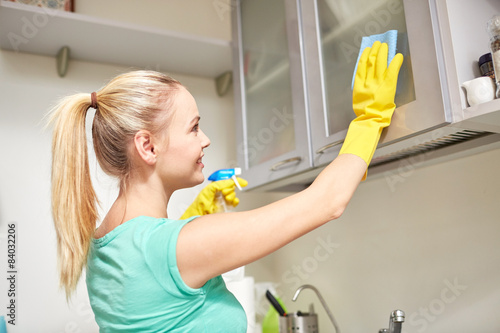 happy, home, woman, kitchen, homemaker, cleaning, cabinet, cleanser, bottle, spray, rag, wipe, clean, cleanliness, protective, housework, washing, cleaner, occupation, glove, people, person, female, concept, indoor, lifestyle, young, interior, cheerful, beautiful, hygiene, domestic, housekeeping, household, girl, smiling, maid, manual, employment, professional, men at work, servant, chore, workplace, work, help, hired, purity, housecleaning, dirty