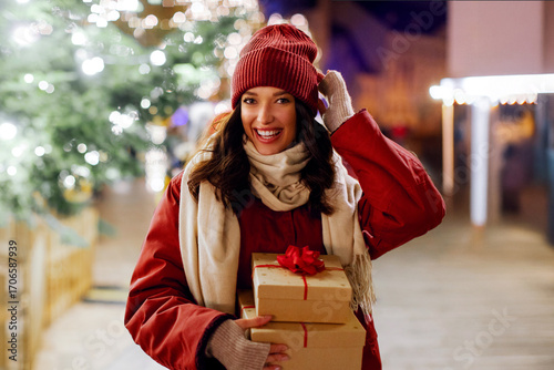 Happy woman holding gift boxes standing near decorated Xmas tree, walking and enjoying Christmas fair on the street at night in the city