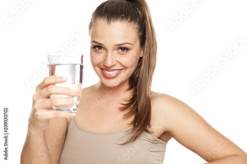 happy woman holds a glass with water on white background