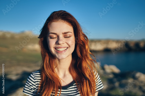 happy woman in the mountains on the beach near the lake vacation relax smile model