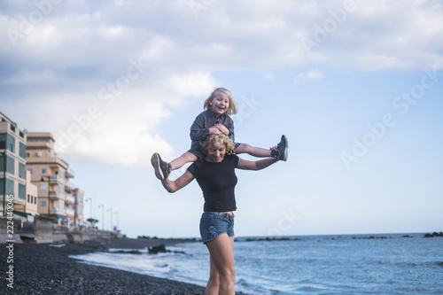 happy woman mother walk with his son long hair blonde walking at the beach carrying him on the back. beautiful people enjoying lifestyle and life outoor with the nature. vacation and lifestyle concept