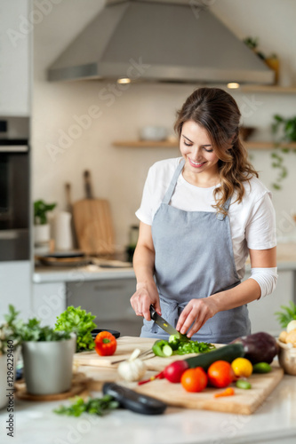 cooking, woman, kitchen, food, chef, ingredient, home, healthy, meal, preparation, modern, lifestyle, vegetable, apron, fresh, culinary, organic, diet, chopping, domestic, salad, cook, vegetable, eating, lunch, knife, smiling, smile, eat, pepper, preparing, dinner, cutting, tomatoes