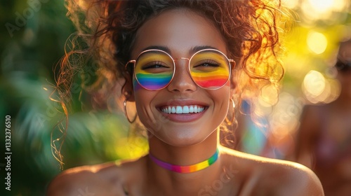 pride, gay, lesbian, bisexual, transgender, queer, rainbow, sunglasses, festival, woman, happy, smiling, outdoors, summer, celebration, colourful, joyful, vibrant, freedom, love, acceptance, community, diversity, equality, right, parade, event, party, portrait, model, beautiful, fashion, style, hair, smile, face, expression, joy, happiness, positive, optimistic, confident, attractive, gorgeous, radiant, bright, sunshine