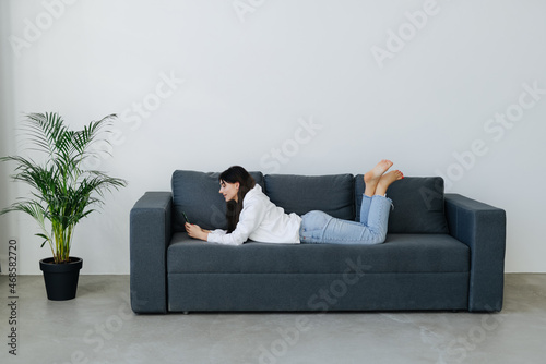 phone, woman, home, couch, adult, mobile, room, young, living, technology, beautiful, smiling, smart, indoor, sitting, people, interior, lifestyle, smartphone, casual attire, message, apartment, wireless, life, person, female, happy, holding, using, house