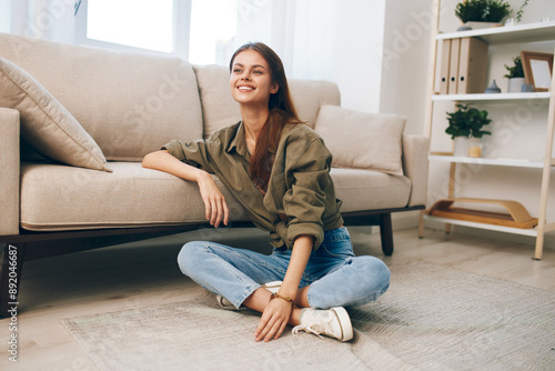 Happy Woman Relaxing on a Cosy Sofa in a Modern Apartment, Enjoying a Peaceful Holiday