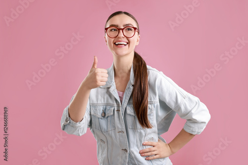 accept, adult, agree, agreements, approval, approve, approved, background, beautiful, carefree, caucasian, cheerful, communication, confident, confirm, decision, excellent, female, fine, finger, fun, gesture, gesticulate, goggles, good, great, happy, joy, lifestyle, like, model, nonverbal, person, pink, portrait, positive, showing, signs, smiling, social, studio, success, super, support, symbol, thumb, thumb up, up, woman