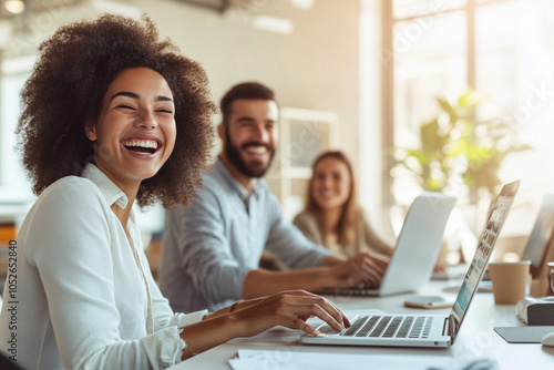 happy, female, smile, office, laptop, work, modern, professional, confident, business, teamwork, collaboration, workplace, colleague, desk, positivity, joyful, career, technology, casual attire, workspace, success, motivation, enthusiasm, people, productivity, contemporary, job, corporate, networking, co-worker, diversity, multicultural, lifestyle, communication, digital, working, woman, sharpened, employee, computer, businesswoman, businessman, team, meeting, businessperson, smiling, executive