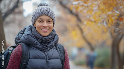 woman, portrait, smiling, happy, winter, city park, urban, fall foliage, leaf, tree, autumn, nature, season, cold, weather, jacket, beanie, foulard, backpack, casual attire, street, style, fashion, travel, city landscape, people, urban life, young, female, lifestyle