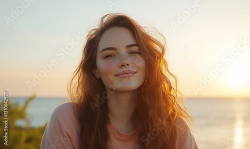 woman, portrait, sunset, beach, happy, beautiful, hair, auburn, model, sea, ocean, calm, serene, peaceful, beauty, wellness, travel, summer, golden hour, photo, girl, young, natural, light, wave, healthy, lifestyle, marketing, advertising, commercial, image, happy woman, beautiful woman, sunset beach, golden light